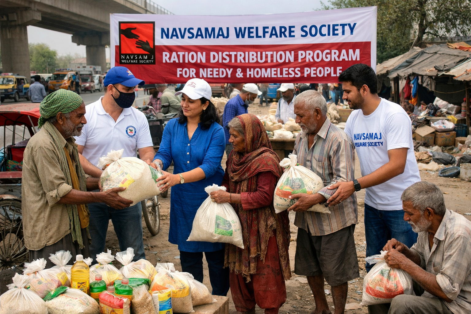 Navsamaj Welfare Society Distributed Ration Among Roadside Needy People Navsamaj Welfare Society organized a Ration Distribution Program for needy and underprivileged people living